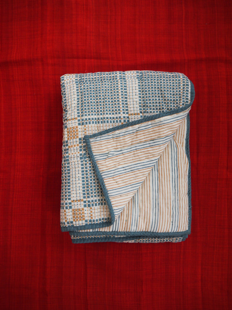 Our reversible throw, made by hand over many months, consists of block-printed percale cotton and natural cotton fill. Each quilt is hand-stitched using a traditional unknotted running-stitch technique.