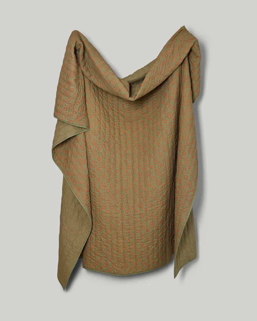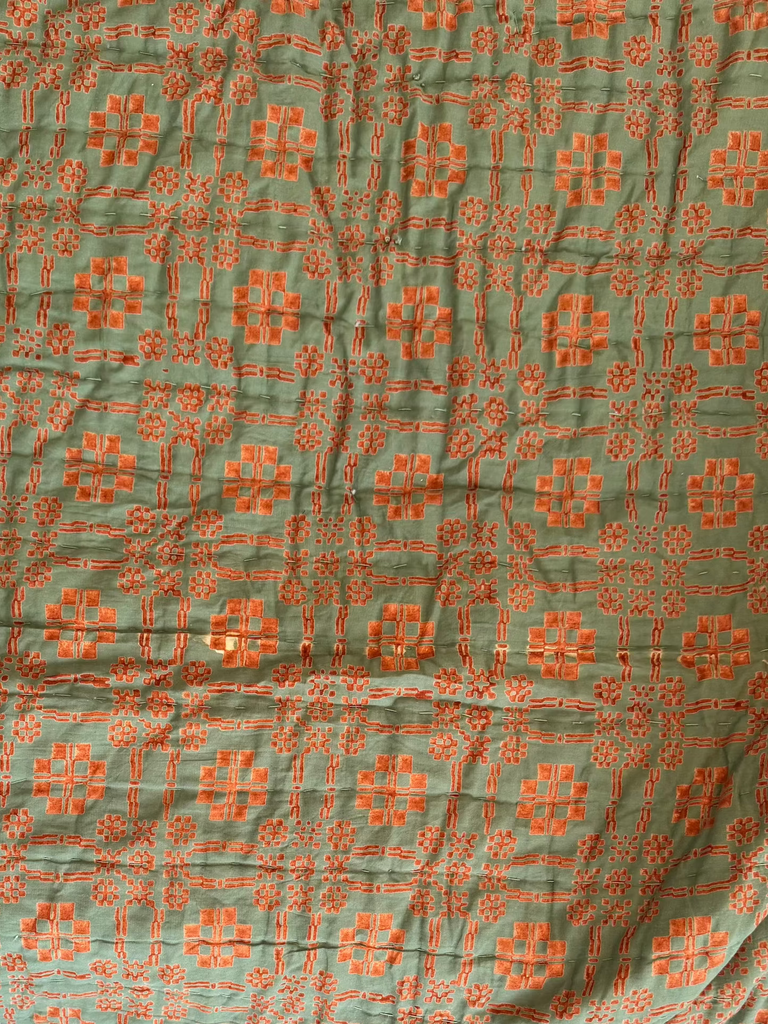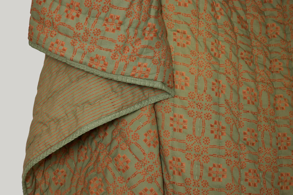 Our reversible quilt, made by hand over many months, consists of block-printed cotton and natural cotton fill. Each quilt is hand-stitched using a traditional unknotted running-stitch technique.