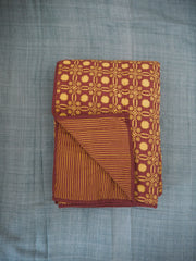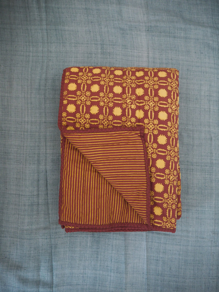 Our reversible throw, made by hand over many months, consists of block-printed percale cotton and natural cotton fill. Each quilt is hand-stitched using a traditional unknotted running-stitch technique.